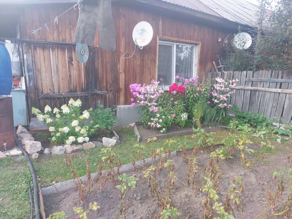 На участке расположено несколько цветников с многолетниками, грядки с клубникой, две поликарбонатные теплицы (6*3 м и 2*3 м), беседка 3*4 м, мангал, плодоносящие яблони, вишни, груша, несколько кустов смородины, малина, сирень. Площадка перед домом, зона для отдыха и дорожки выложены плиткой. Перед домом место для парковки двух авто.