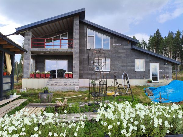 Новый дом - фундамент свайный, стены из профилированного бруса 150*150, 2 этажа, общая площадь 135 кв.м, вставлены окна и сделаны откосы с улицы и со стороны дома. Установлена дверь с терморазрывом. Смонтировано крыльцо и навес над ним.