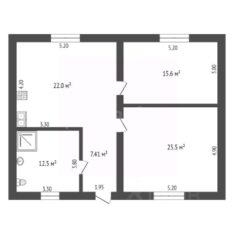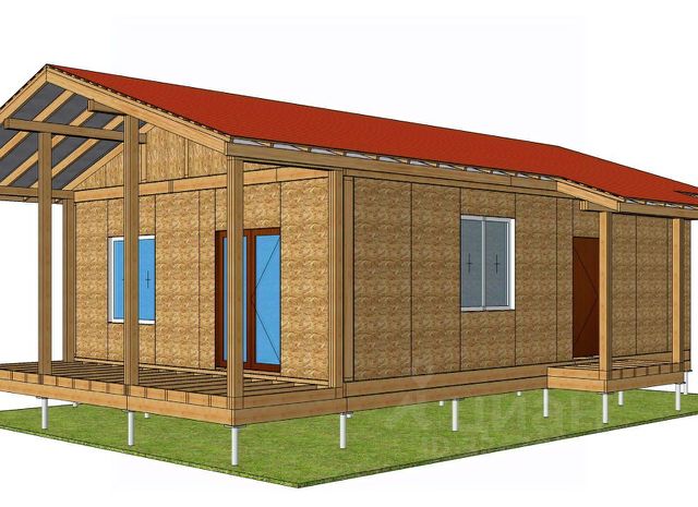 Планировка дома включает в себя просторную кухню-гостиную, две изолированные комнаты и большой санузел совмещенный с котельной.