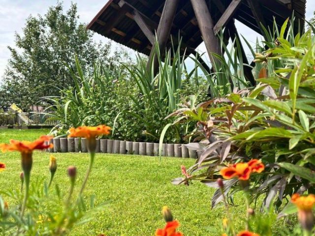 Беседка 30 кв. м (из бревна)- ленточный фундамент, на полу залита стяжка с декоративным камнем, установлена печь для барбекю, большой деревянный стол ручной работы, скамейки, диван, несколько шкафчиков для хранения. Рядом в беседкой - мастерская, дровенник, два помещения для хранения садового инвентаря.