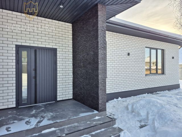 Современный и практичный фасад, из белого кирпича, который дополняют точечные, уличные светильники. Входная группа оформлена большим крыльцом, которое располагается под отдельной крышей. Крыльцо выполнено из монолита, облицованного плиткой. Для удобства подъема, спуска сделаны ступени. На крыльцо выведено освещение. Установлена современная, морозостойкая входная дверь.