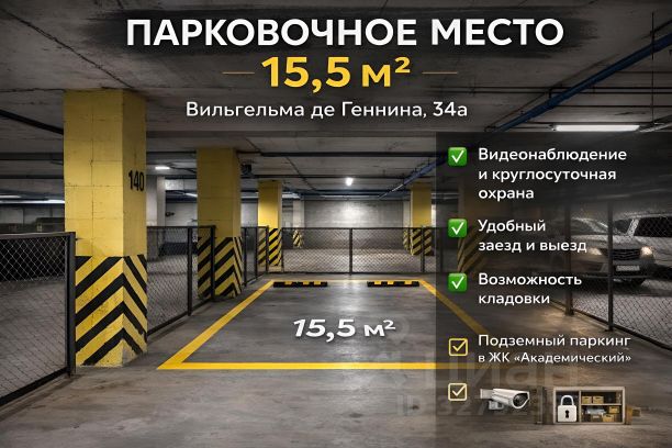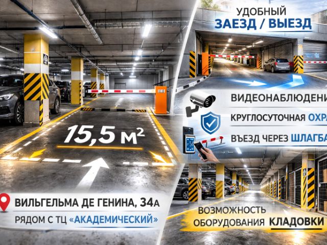 Продаю свое просторное, сухое место 15.5 кв.м в подземном паркинге по адресу Вильгельма де Генина, 34 а, рядом с ТЦ Академический. Удобный заезд и выезд. Видеонаблюдение, круглосуточная охрана, въезд через шлагбаум. Один собственник. Есть возможность дооборудовать машиноместо кладовками (по согласованию с управляющей компанией)! Звоните, самая низкая цена в жк Машина, велосипеды, колеса и тд будут в тепле, сухости и безопасности!