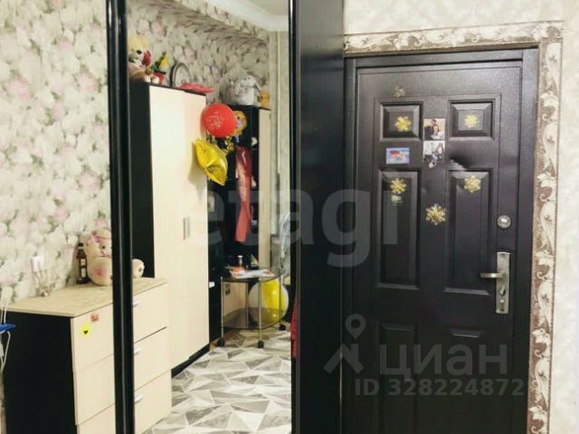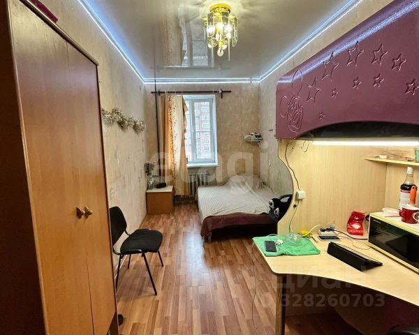 В комнате свежий косметический ремонт. Дверь в комнату качественная, железная. Окно пластиковое. Натяжной потолок, со встроенными светильниками, на полу линолеум. Огорожено место под прихожую - гардероб. Вся мебель в комнате остаётся покупателям.