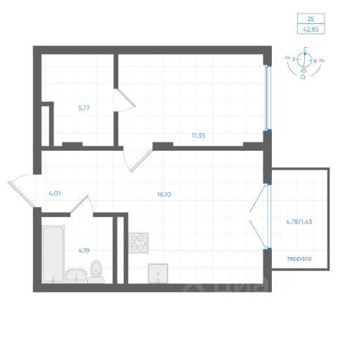 Квартира с кухней-гостиной и одной спальней в районе Шишимская горка. Особенности планировки: вид во двор, предчистовая отделка, терраса.