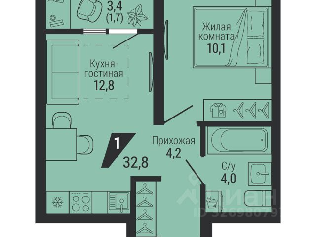Общая площадь составляет 57,2 квадратных метров, включая две комнаты площадью 10,30 и 10,20 кв. м., кухню-столовую 18,90 кв.м., совмещённый санузел - 4,40 кв. м., санузел - 1,80 кв. м., коридор - 11,60 кв.м; высота потолков достигает 2,72 метра. Внутренняя отделка предусматривает подготовку стен и полов перед финишной отделкой. Из окон открывается вид на променадную улицу.