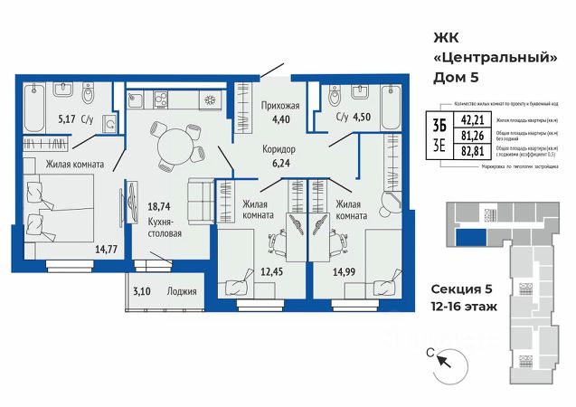 Продается 3-к квартира в жилом комплексе Центральный 5