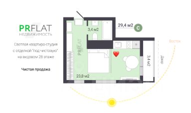 - комната - 23,8 м2 с выходом на лоджию 3,4 м2,