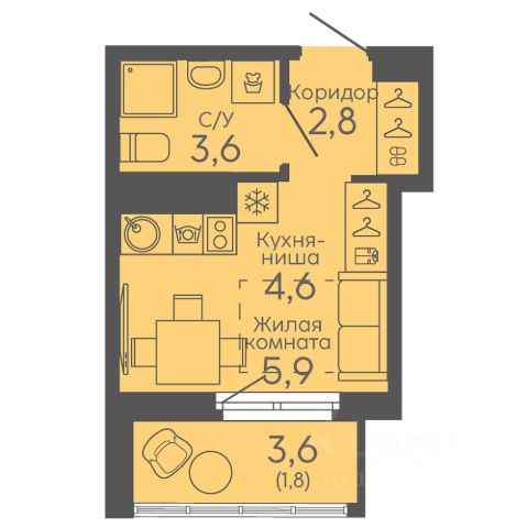 Жилая площадь 7.9 м2, кухня 5.6 м2, чистовая отделка. Раздельных санузлов - нет, балконов - нет, лоджий - нет.