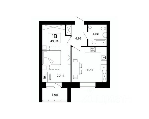 Кухня-гостиная позволяет размещать гостей, обустроить там игровую зону, либо зону отдыха. Спальня имеет достаточную площадь для размещения мест хранения, рабочей и спальной зоны.