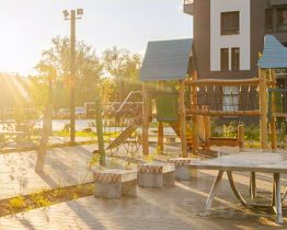 Для маленьких жителей квартала предусмотрена крытая детская площадка, где можно спрятаться от палящего солнца или дождя. Она разделена на несколько зон. Для малышей большая песочница, для ребят постарше безопасные качели, меловые доски, уличные шахматы и спортивные зоны. Все игровые комплексы способствуют развитию логического мышления, творческого самовыражения и физической активности.