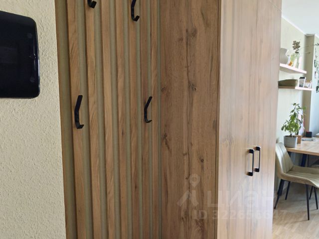 Заходя в квартиру, мы попадаем в коридор, где размещен вместительный шкаф, грамотно организованный для хранения верхней одежды, обуви и хозяйственных принадлежностей. Здесь продумана каждая деталь, чтобы максимально эффективно использовать пространство и обеспечить удобный доступ ко всему необходимому.