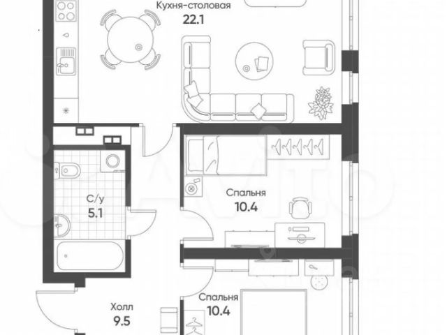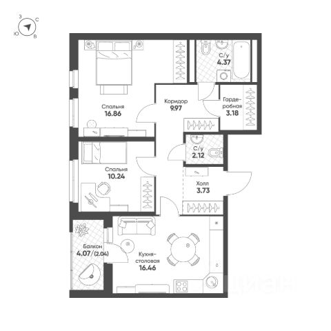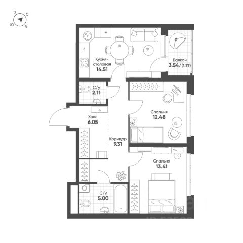 Удачная планировка: просторная кухня-гостиная площадью 14,5 м2 с выходом на лоджию, жилая комната площадью 11,6 м2, совмещенный санузел и вместительный коридор с нишой для хранения !