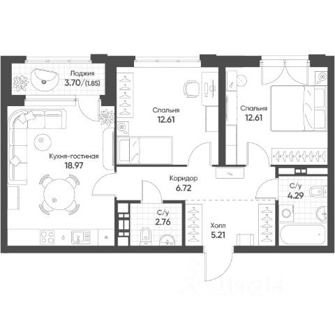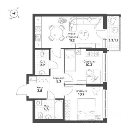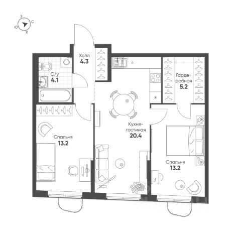 Общая площадь составляет 57,2 квадратных метров, включая две комнаты площадью 10,30 и 10,20 кв. м., кухню-столовую 18,90 кв.м., совмещённый санузел - 4,40 кв. м., санузел - 1,80 кв. м., коридор - 11,60 кв.м; высота потолков достигает 2,72 метра. Внутренняя отделка предусматривает подготовку стен и полов перед финишной отделкой. Из окон открывается вид на променадную улицу.