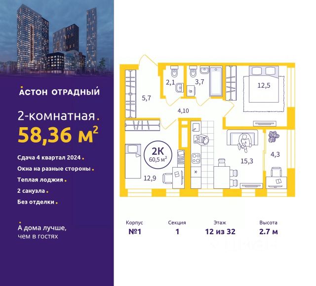 Продается 2-комн. квартира от застройщика в ЖК "Астон.Отрадный" на 12 этаже. Квартира без отделки, новый собственник может сделать ремонт по индивидуальному проекту. Общая площадь: 58.36 кв.м., жилая: 25.4 кв.м., площадь просторной кухни-столовой: 15.3 кв.м. Угловая квартира, идеально подойдет любителям тишины и панорамных видов. В квартире одна лоджия, один совмещенный и один раздельный санузел. Высота потолков 2.7 м. Квартира находится в корпусе 1. Дом монолитный, одноподъездный, высотой 32 этажа. На этаже 16 квартир. В подъезде 4 грузовых лифта. Начало строительства - 4 квартал 2022 года. На сегодняшний день строительство завершено, дом сдан в 4 квартале 2024 года. Оформление сделки по договору купли-продажи. Астон. Отрадный разместится на первой линии нового жилого района на ВИЗе, пересечение улиц Репина-Коперника. В первой очереди - высотная башня-32 этажа и малоэтажный дом-9 этажей. Внутри - уютное лобби с мягкой зоной, зона рецепции, выход в закрытый двор. С внешней стороны - бытовые сервисы, кафе и магазины "у дома". Развитая социальная инфраструктура-школы, детские сады, поликлиники, продуктовые магазины-все в шаговой доступности. На первых этажах жилого комплекса будет торговая галерея с кофейней. Удобная транспортная доступность-возле дома есть трамвайные и автобусные остановки, выезд на ЕКАД и две магистральные улицы Репина и Викулова. Двор в Астон Отрадный будет полностью изолирован от машин для комфортного и безопасного отдыха разного формата. Для детей продумываются детально площадки с современным оборудованием и использованием экологичных материалов. Предусмотрена спортивная зона с тренажерами и беговой дорожкой по периметру двора. Нам важно создать здоровую атмосферу, в которой будущим жителям захочется отдыхать. Вокруг фасадов раскинутся яркие многоярусные клумбы. Выбор квартиры в Астон. Отрадный - увлекательный процесс, потому что вариантов очень много). Когда вы определитесь, вас не будет покидать ощущение — "мое". То состояние, когда каждой клеточкой тела чувствуешь, что выбор правильный, а квадратные метры — не просто цифры на бумаге, а десятки сценариев счастливой жизни. На территории предусмотрено круглосуточное наблюдение, для полной безопасности жителей. Вход в комплекс осуществляется по специальным ключам доступа. #Z4d3ST