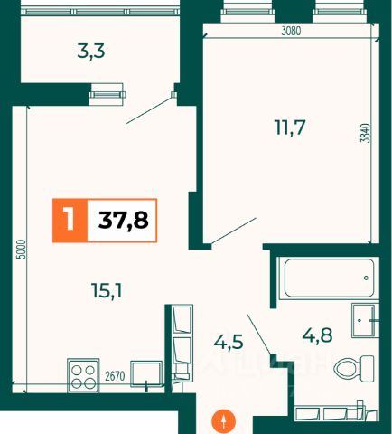 - общая площадь 39 м2, кухня 11 м2, комната - 14,7 м2, балкон