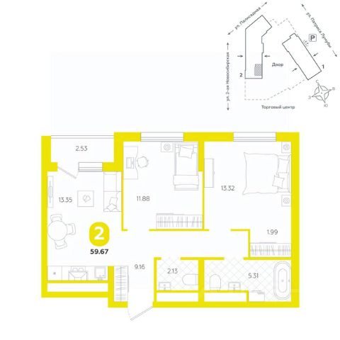 Квартира находится в ЖК "Бодровский" от федерального застройщика "Паритет Девелопмент". Это жилой комплекс комфорт-класса с современной архитектурой, расположенный в Екатеринбурге в районе улиц Патриса Лумумбы и 2-й Новосибирской. Добраться от него до центра города можно всего за 25 минут, дорога до ЕКАДа займет 12 минут. В окружении жилого комплекса есть шесть детских садов, пять школ, три больших парка, пять спорткомплексов, в том числе курортный комплекс Уктус. Квартал состоит из двух секций переменной этажности (от 14 до 24 этажей) и подземного паркинга с кладовыми, к которым можно будет спуститься на лифте. На первых этажах предусмотрены коммерческие помещения: жители смогут сделать маникюр, воспользоваться услугами ателье, выпить кофе с круассаном, не покидая своего района. Ввод в эксплуатацию в III кв. 2027 года. Территория комплекса огорожена от машин и посторонних людей. Озеленение с многолетними растениями и деревьями создает ощущение близости к природе. Двор наполнен всем необходимым: песочницы и качели для самых маленьких, интерактивная башня для детей постарше, воркаут-зона и места для отдыха. На всей территории реализована безбарьерная среда. В парадных выполнен авторский ремонт. За счет панорамного остекления и 4-метровых потолков там всегда много естественного света. Предусмотрены колясочные с местами для хранения спортинвентаря и креплениями для велосипедов. В проекте представлены студии, классические одно- и двухкомнатные варианты, а также двух-, трех- и четырехкомнатные квартиры в евроформате площадью от 25,32 до 76,65. Все планировки — функциональные и подходящие новоселам как с детьми, так и без них. Есть варианты с лоджиями, где можно организовать дополнительное пространство для отдыха, спорта или работы, а еще квартиры с мастер-спальней, гардеробной, двумя санузлами. В каждой предусмотрена вытяжная вентиляция с естественным побуждением, счетчики с телеметрией и корзины для кондиционеров. Характеристики квартиры: этаж - 1 количество комнат - 2 номер помещения - 132 площадь квартиры - 59,67 кв.м Чтобы сэкономить время и деньги, можно приобрести квартиру сразу с ремонтом от застройщика. На выбор 3 конфигурации: базовый, с кухонным гарнитуром, с кухонным гарнитуром и другой мебелью - в светлом и темном оттенках. Ремонт можно включить в ипотеку.
