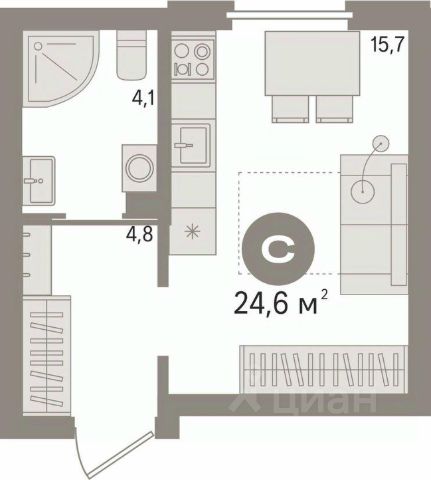 Планирoвкa квартиры: куxня - гостиная - 21,6 м2, cпальня - 10,2 м2 с кабинетом 2,4 м2, санузел - 5,0 м2, прихожая - 3,1 м2.