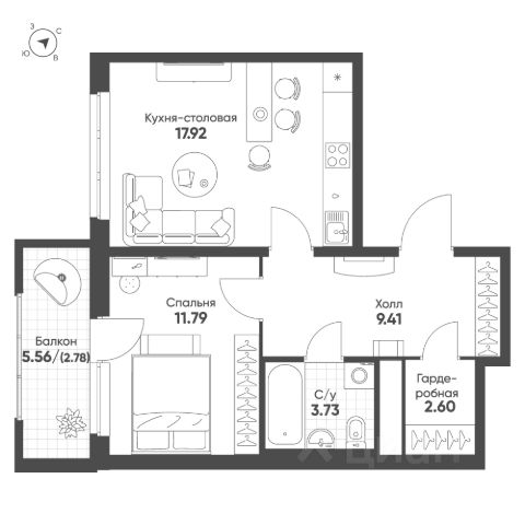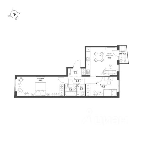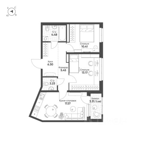 Удобная планировка с кухней и двумя изолированными комнатами, просторным коридором и санузлом, гардеробной/хозяйственной комнатой.