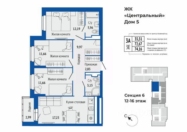 Продается 3-к квартира в жилом комплексе Центральный 5