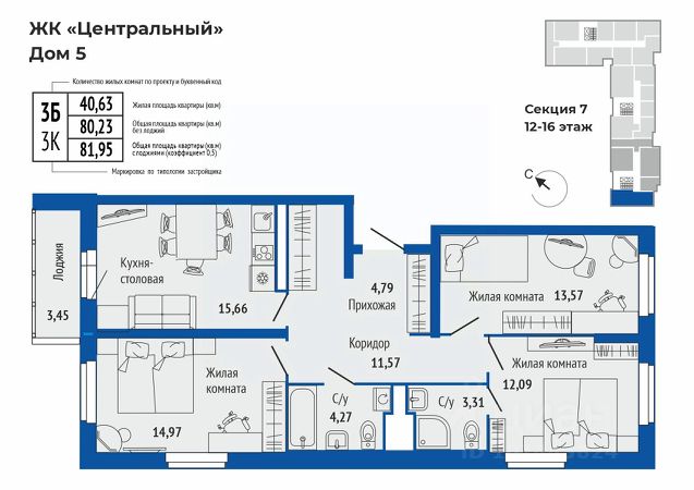 Продается 3-к квартира в жилом комплексе Центральный 5