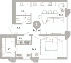 1-комн. квартира с предчистовой отделкой в ЖК "Гоголя 21" на 16 этаже. Общая площадь: 74.06 кв.м., жилая: 24.4 кв.м., площадь просторной кухни-столовой: 28.2 кв.м. Угловая квартира, очень светлая, естественная вентиляция при открытии окон. В квартире один совмещенный и один раздельный санузел. Высота потолков 2.98 м.