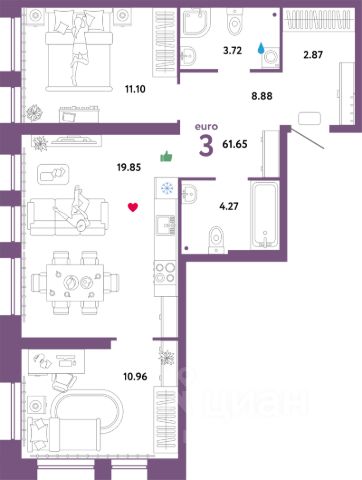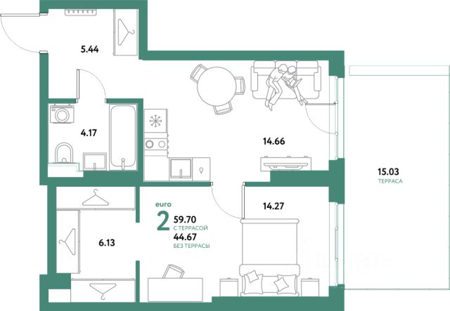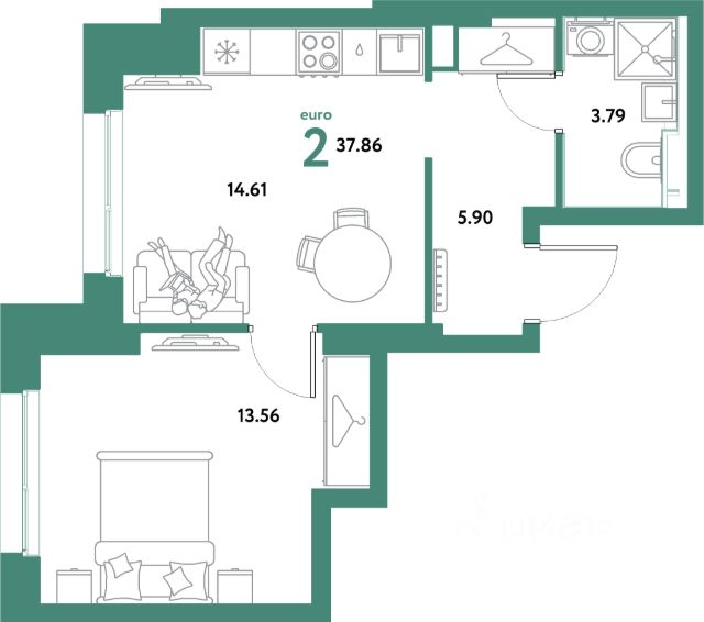 Общая площадь 34,8 м. кв. + лоджия 8,8 м.кв.