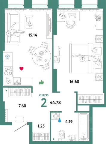Возможна перепланировка: на месте кухни обустроить спальню с увеличением до 7,7 м.кв., а в комнате просторную кухню-гостиную.