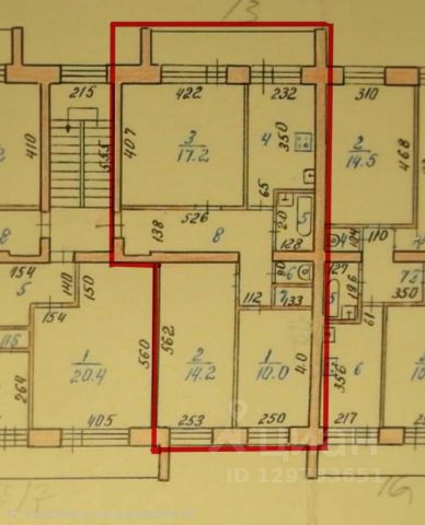 Комнаты раздельные площадью 20,4 и 17,3 м2, площадь кухни 8 м2