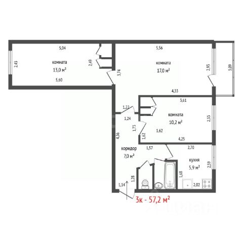 Двухкомнатная квартира от застройщика с предчистовой отделкой в ЖК "Квартал Траектория" на 2 этаже. Общая площадь: 56.9 кв.м., жилая: 18.8 кв.м., площадь просторной кухни-столовой: 17.3 кв.м. Комнаты изолированные, все окна выходят на одну сторону. В квартире одна лоджия, два совмещенных санузла. Высота потолков 2.82 м.