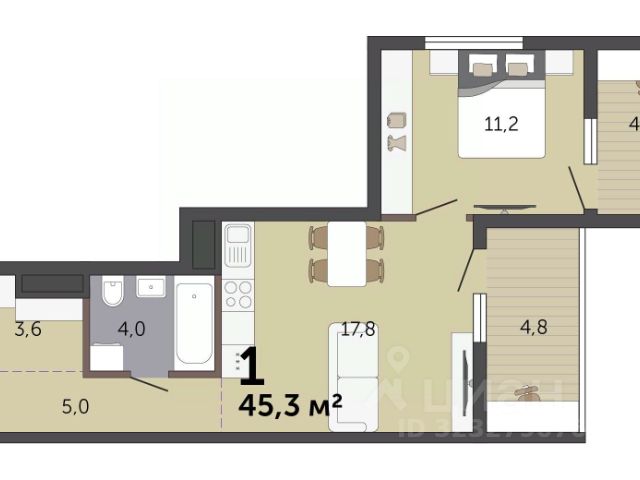Продаётся 1-комнатная квартира в строящемся доме (Дом 6), срок сдачи: III-кв. 2027, общей площадью 45.3 кв.м., на 4 этаже. Расположение, транспортная доступность Жилой комплекс "Малевич" включает в себя пять монолитных односекционных зданий класса "комфорт" высотой от 26 до 34 этажей. Каждый из домов комплекса имеет свой цвет (красный, желтый, зеленый, оранжевый, синий). На создание архитектурной концепции комплекса ее авторов вдохновили идеи супрематизма от основоположника этого направления абстрактного искусства - Казимира Малевича. Пять зданий "Малевича" располагаются в микрорайоне Пионерский, рядом с Проспектом Космонавтов и улицей Маяковского, на расстоянии менее одного километра от метро "Уральская", железнодорожного вокзала "Екатеринбург-Пасс.", Северного автовокзала и Привокзальной площади; в полутора километрах от метро "Динамо", примерно в трех километрах от исторического центра города. Инфраструктура Собственная инфраструктура комплекса включает в себя располагающиеся на первых этажах зданий: детский клуб, фитнес-центр, ресторан и гастроном. Рядом с "Малевичем" и в радиусе двух километров от него находятся: детский клуб "Озорляндия", детские сады 106, 91, 230, школы 146, 3, гимназия 47, Гуманитарный университет, гипермаркет "Лента", гастроном "Мегамарт", бизнес-центр "Форт", торгово-развлекательный центр "Парк хаус" с гипермаркетом "Карусель", кафе, ресторанами и кинотеатром, фитнес-центром и детскими аттракционами, торговые центры "Свердловск", "Олимп", "Чайка", магазин сети "Курико", торгово-офисный центр Active Park, супермаркеты "Магнит", "Дикси", фитнес-клуб "Пионер". Чуть далее располагаются: центральная городская больница 3, гипермаркет OBI, Дворец культуры железнодорожников, "Ельцин Центр", кинотеатр "Космос", спорткомплексы "ДИВС" и "Динамо", ТЮЗ и другие культурные достопримечательности центральной части города. Экологическая ситуация в районе считается удовлетворительной. Рядом с "Малевичем" проходят проспект Космонавтов и железная дорога, располагаются промзоны и оптовые базы. Недалеко расположена зеленая зона - Основинский парк. Из окон зданий открываются виды на центральную часть города, железнодорожный вокзал и Верх-Исетский пруд. Надежность застройщика Жилой комплекс "Малевич" построила созданная в 2007 году екатеринбургская компания Prinzip. Это одна из самых оригинальных компаний на строительном рынке в уральской столице. Каждый ее проект уникален с точки зрения архитектуры и концепции. Самые известные проекты Prinzip в родном городе, помимо "Малевича" - жилой квартал "Ньютон Парк", жилой дом "Победа", жилой комплекс "Дом на Максима Горького, 17", малоэтажный поселок "Светлореченский", штаб-квартира банка "Кольцо Урала", торговый центр "Европа", деловой центр "Суворов", бизнес-центр Aurora. Проект "Малевича" был разработан "Проектным бюро Р1" и архитектурным бюро "ОСА". Основные строительно-монтажные работы при возведении пяти зданий комплекса выполнила компания "Альфа-Строй". Архитектура В пяти здани