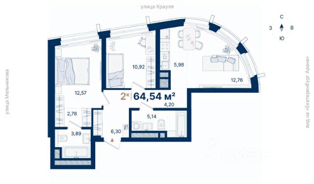 Общая площадь - 88,2 м2: холл и просторная кухня-гостиная со столовой зоной - 45,9 м2, две спальни - 17,4 м2 и 19,9 м2, совмещенный санузел, просторная лоджия 9 м2 с местами для хранения. Окна - в сторону улицы Ключевской.