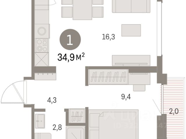 Продаётся квартира площадью 32.82 м2 в жилом комплексе "Эхо леса". Квартира находится на 5 этаже дома, который будет введен в эксплуатацию в 1 квартале 2028 года. Жилая площадь квартиры 10.31 м2, площадь просторной кухни — 15.9 м2. Среди особенностей планировки — изолированные комнаты с окнами на одну сторону, 1 совмещённый санузел. Жилой комплекс "Эхо леса" — это: дом в эко-стиле двор с выходом в лесопарк лаконичная архитектура развитая инфраструктура вокруг квартала Срок сдачи — I кв. 2028 Инфраструктура В окружении проекта — вся необходимая инфраструктура: детские сады, школы, спортивный комплекс, продуктовые магазины, аптеки, кофейни, рестораны и салоны красоты. Благоустройство Концепция двора-парка продолжает тему леса. Ландшафт с продуманным всесезонным озеленением дополняют акценты: сухой ручей из камней, столы и навесы из натурального дерева, эко-тропы, фонтан и променад. Для взрослых предусмотрены пешеходные и велодорожки, для детей — игровые площадки для разных возрастов. Архитектура Переменная высота секций создаёт выразительный архитектурный облик. На фасадах — игра контрастных, при этом природных оттенков. Динамики зданию придают текстуры материалов: фактурной штукатурки и клинкерного кирпича. Лобби Интерьер в холле продолжает концепцию квартала и выполнен в эко стиле. В отделке используются элементы природных материалов с изображениями листвы и деревьев. Паркинг Тёплый подземный паркинг организован как единое пространство с собственным дизайном. Кладовые Индивидуальные помещения на техническом этаже — способ сохранить пространство в квартире. Попасть в кладовые можно на лифте. Планировки В продуманных планировках выделены тихие и шумные зоны. Приватные спальни и кабинеты спрятаны от маршрутов домашнего движения, а кухни-гостиные с барной стойкой вместо стены — всегда готовы к семейным праздникам. Из окон квартир открываются живописные виды на лес.