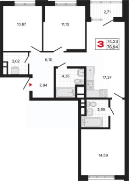 Планирoвкa квартиры: куxня - гостиная - 21,6 м2, cпальня - 10,2 м2 с кабинетом 2,4 м2, санузел - 5,0 м2, прихожая - 3,1 м2.
