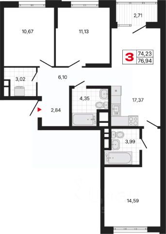 Санузел в керамической плитке, будут установлены подвесная раковина с тумбой, шкаф с зеркалом и подсветкой, глубокая и широкая акриловая ванная, подвесной безободковый унитаз, душевая стойка с тропическим душем, полотенцесушитель, предусмотрены выводы для слива воды стиральной машины и водонагревателя,