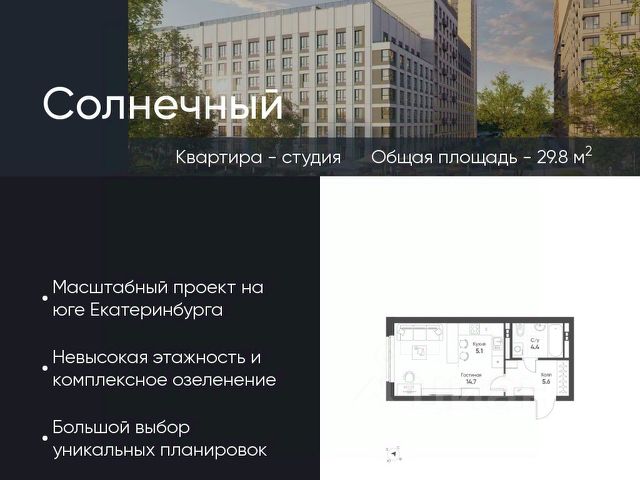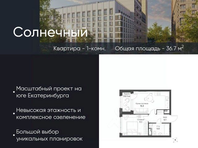 Продается квартира евро-формата в районе Солнечный от застройщика Синара-Девелопмент. **О квартире:** Общая площадь - 39,1 м. Правильная планировка, окна во двор. Просторная комната (15,7 м) и кухня-гостиная (16,5 м). Утепленная лоджия с панорамными окнами. Дизайнерский ремонт. Вся мебель и техника остаются новым владельцам. **О сделке:** Без перепланировок. Полная стоимость указана в договоре. Подходит под ипотеку. Чистая продажа. **Об инфраструктуре:** Средняя общеобразовательная школа 215. Губернаторский лицей. Детские сады ("Солнечный лучик", "Галактика"). Ледовая арена "Автомобилист". Центр художественной и эстетической гимнастики. Удобная транспортная развязка: остановки общественного транспорта рядом. Сетевые продуктовые магазины и аптеки. Звоните и записывайтесь на просмотр! Помогу оформить ипотеку. ID объекта в нашей базе: 11956