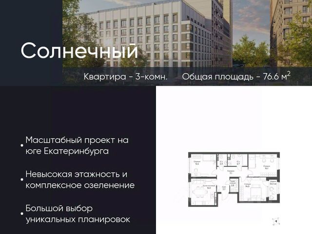 В продаже 3-комнатная квартира (по функционалу 4Е) на комфортном 5 этаже в Европейском современном районе Солнечный с высокоразвитой инфраструктурой. Дом 2023 года постройки, Застройщик - Синара-девелопмент. В квартире удачная планировка с изолированными комнатами. Высота потолка 2.7 м. Окна в квартире большие и выходят на разные солнечные стороны света юго - западную и северо-западную, преимущественный вид из окон - во двор. В квартире выполнена замена ламината на высококачественный практически во всех помещениях. Выполнена замена розеток, выключателей. В просторной кухне гостиной 17,5 кв.м. выделена обеденная и гостевая зоны. Кухонный гарнитур Лорена со встроенной техникой (посудомойка Bosch, духовой шкаф - Electrolux, варочная поверхность - Bosch, вытяжка - Еlika). На кухне установлен высококачественный влагостойкий немецкий ламинат Classen. Три изолированные спальни правильной прямоугольной формы имеют площади 12,0, 11,4 и 10,4 кв.м. соответственно, одна из спален оснащена выходом на теплую лоджию 3,5 кв.м. В квартире предусмотрена функциональная гардеробная - 3,8 кв.м. Гостевой и семейный санузлы в высококачественном кафеле, установлены: теплый пол, натяжные потолки, заменена сантехника. В шаговой доступности: ледовый дворец Арена, Парк, школа и садики, супермаркеты, кафе, маркетплейсы, остановки автобусов и маршрутных такси, в 10-15 минутах ходьбы: Губернаторский лицей, центр Художественной гимнастики, остановка трамвая. Преимущества жилого комплекса и района: * Большой закрытый двор без машинс разнообразием детских площадок, ранжированных по возрастам; * Отличное благоустройство территории и тематические праздники внутри района * Современный парк с детскими площадками * Современная технология горизонтальной разводки труб отопления * Горячая вода круглый год, благодаря собственной котельной * Бесшумные лифты * Своя управляющая компания с удобным приложением для телефона * В подъездах и лифтах установлено видеонаблюдение * в районе своя служба безопасности. Два взрослых собственника. Обмен подобран. Ипотека возможна.