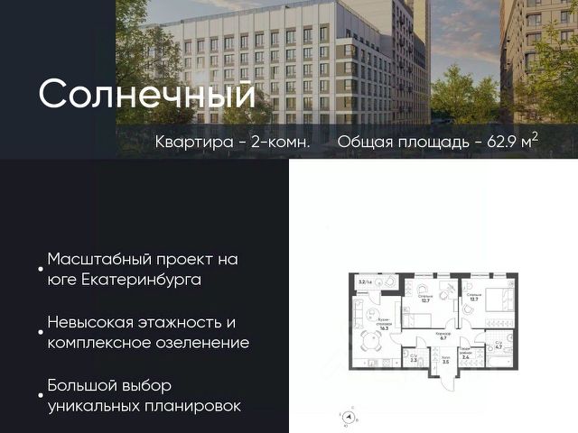 Продается квартира 145, по адресу Свердловская область, г. Екатеринбург, корпус Солнечный, блок 6.4 в Солнечный на 5 этаже, с площадью 62.9 м2.