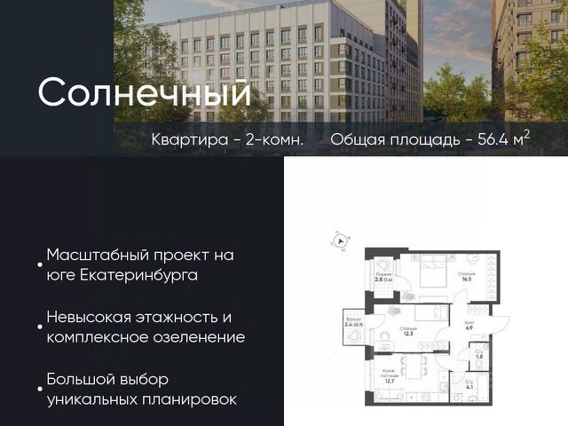 ПРОДАМ очень светлую и уютную Евро 2-х комнатную квартиру с большой кухней-гостиной и вместительной спальней в самом молодом микрорайоне Екатеринбурга. Окна квартиры выходят во двор, лоджия с панорамным остеклением, в подарок новому собственнику останется кухонный гарнитур с варочной поверхностью и духовым шкафом, стол и стулья в гостиной, двуспальная кровать. В доме добрые и приветливые соседи. Закрытый зеленый двор с видеонаблюдением, без машин, с современными детскими и спортивными площадками для любого возраста. Инфраструктура района прекрасно развита! В шаговой доступности находится все, что необходимо для счастливой жизни: три муниципальных детских сада (еще один строится), школа "Созвездие", Уральский Губернаторский лицей, Центр художественной и эстетической гимнастики, ледовая арена "Авто", магазины, аптеки, пекарни, "Жизнь март", досуговые центры, парк "Солнечный", остановки общественного транспорта (трамваи, автобусы и маршрутки). Два взрослых собственника. Документы юридически проверены и готовы к сделке! Долгов, обременений, использованного материнского капитала нет. Не упустите свой шанс, стать обладателем хорошей квартиры, звоните и приходите на просмотр! Покажу в удобное для Вас время!