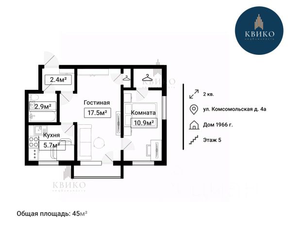 В продаже светлая 2 комнатная квартира в микрорайоне Втузгородок *Квартира:* этаж 5 из 5 2-комнатная квартира: общая площадь - 45 м, кухня - 5,7 м, просторная комната - 17,5 м и спальня 10,9 м, с/у - 2,9 м Квартира без ремонта Удачное расположение, нет городского шума Дом: Дом 1968 года. Тихий спокойный двор Парковка во дворе. Домофон, интернет/телевидение в доме. Прекрасная транспортная развязка: рядом конечная остановка троллейбусов, на перекрестке автобусные остановки, до трамвайной остановки 5 минут пешком Рядом юридическая академия (УрГЮУ), в шаговой доступности УГТУ-УПИ (7-10 минут) *Легко купить:* наличные, ипотека. Поможем с реализацией вашей недвижимости для приобретения данного объекта. Помощь в одобрении ипотеки по наилучшим ставкам от банков-партнёров. Агентство недвижимости "Квико" гарантирует своим клиентам безопасность сделки. Наша профессиональная деятельность застрахована. ID объекта в нашей базе: 4708