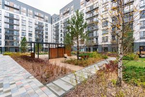Двор наполнен зонами для игр, прогулок и отдыха для всех возрастов, с большим количеством зелени, спортивными площадками и прогулочными аллеями.