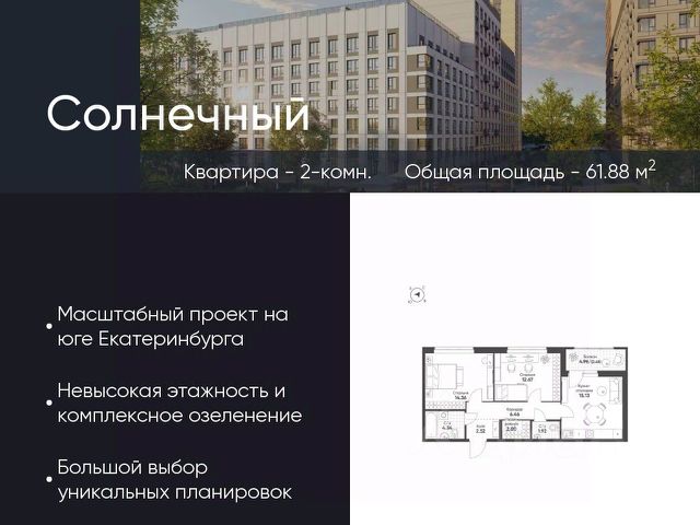 Продается квартира 443, по адресу Свердловская обл., г. Екатеринбург, Чкаловский район, корпус Солнечный, корпус 6.2 в Солнечный на 6 этаже, с площадью 61.88 м2.