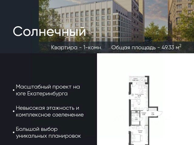 Продается квартира 307, по адресу Свердловская обл., г. Екатеринбург, Чкаловский район, корпус Солнечный, блок 6.3 в Солнечный на 6 этаже, с площадью 34.2 м2.
