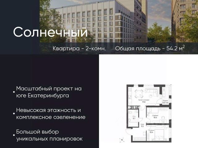Продается квартира 538, по адресу Свердловская обл., г. Екатеринбург, Чкаловский район, корпус Солнечный, блок 6.3 в Солнечный на 6 этаже, с площадью 54.2 м2.
