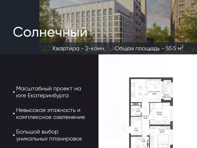 Продается квартира 529, по адресу Свердловская обл., г. Екатеринбург, Чкаловский район, корпус Солнечный, блок 5.4, корпус 2 в Солнечный на 6 этаже, с площадью 55.5 м2.