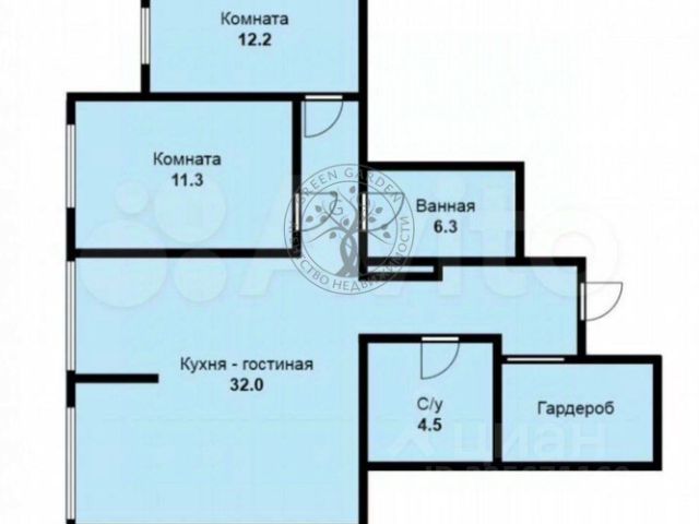 Простор и свет: Общая площадь 77.3 м с изолированными комнатами 11,3 м и 12,2 м.
