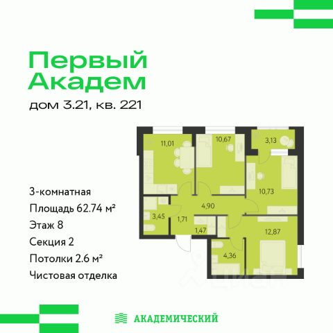 Спешите оформить бронирование, пока действует скидка! Предложение ограничено! Стоимость квартиры указана со скидкой, ваша экономия составит 410,000 RUB. Информация по телефону, мы вам все подробно расскажем! Квартира с кухней-гостиной и тремя спальнями в Бруснике в Академическом. Особенности планировки: окна на две стороны, второй санузел, разнесённые спальни, предчистовая отделка, балкон, терраса на крыше. квартиры в нашей базе: АКД05-Ж6.8.4. Квартал "Брусника в Академическом" расположен в границах улиц Ландау — Новая. Сегодня Академический — молодой, стремительно развивающийся район, обеспеченный всей необходимой инфраструктурой. С центром его связывают две магистральные улицы — Вильгельма де Геннина и Амундсена. Последняя в перспективе соединится с ЕКАДом, что позволит жителям быстрее выезжать из города. Согласно утвержденному проекту планировки территории в пешеходной доступности от квартала Брусники появятся две школы, рассчитанные на 1700 мест, и шесть детских садов. Рядом со строящимися домами расположены две крупные зелёные зоны — Юго-Западный лесопарк и Преображенский парк. В школах раиона совместно с учеными УрО РАН будет реализован проект "Малая академия наук", предпогагающий регулярные экскурсии в отраслевые институты и лаборатории, участие в научных конференциях и мастер-классах. Также в Академическом уже построены, теннисная академия и дворец дзюдо, крупные ТРЦ "Краснолесье" и ТРЦ "Академический", гипермаркет "Лента", в планах — организация ИT-кластера и новых филиалов НИИ. Камерные дворы квартала закрыты от машин. По нашим стандартам 70% их территории покрывает зелень. Деревья, кустарники и травы подобраны таким образом, чтобы в каждый сезон двор оставался красивым и имел свой цвет. Каждый двор разделён на зоны. В одной расположены детские площадки, в другой — места для спорта и тихого отдыха взрослых. Особенность ландшафта дворов — дождевые сады, снижающие нагрузку на ливневую канализацию. Они впитывают сток с крыш и тротуаров, фильтруют его в специально подобранном субстрате и отправляют в пруд. #zsoT1d