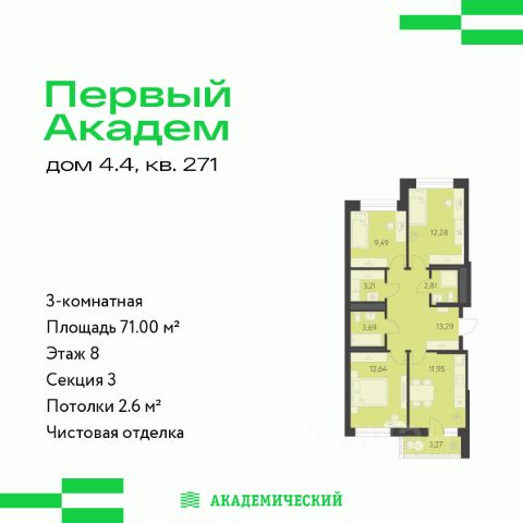 Продается 3-комнатная квартира площадью 71 кв.м. от девелопера "Академический" в жилом квартале "Первый Академ". Срок сдачи дома в 2028 году. Выгоды и скидка напрямую от застройщика. Дом расположен на въезде в район, отличается удобной транспортной развязкой. Рядом новая трамвайная линия и остановка общественного транспорта. Эко-тренды во дворах. Холлы и фасады в стиле ар-деко. В продаже имеются квартиры с видом на парк. На территории квартала предусмотрено множество удобств для жильцов, включая видеонаблюдение 24/7, двор без машин, кладовые и подземный паркинг с выходом из лифта, коммерция на первых этажах. В числе особых преимуществ близость к Юго-западному лесопарку и ТРЦ "Академический": магазины, кафе, парк развлечений, кинотеатр, фитнесс-центр с бассейном.