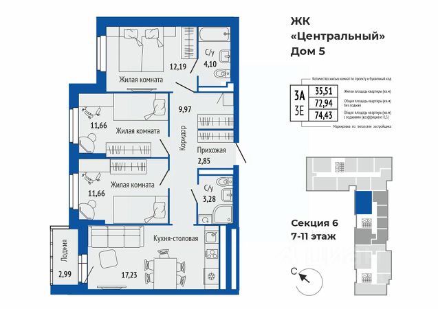 Продается 3-к квартира в жилом комплексе Центральный 5