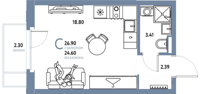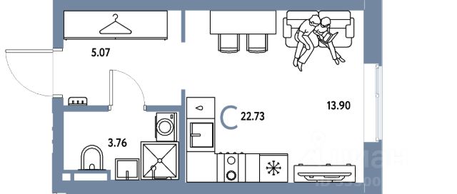 - Санузел совмещённый - легко помещается БОЛЬШАЯ стиральная машина.