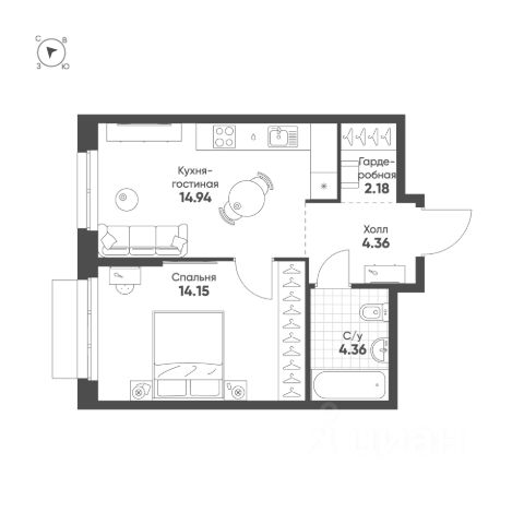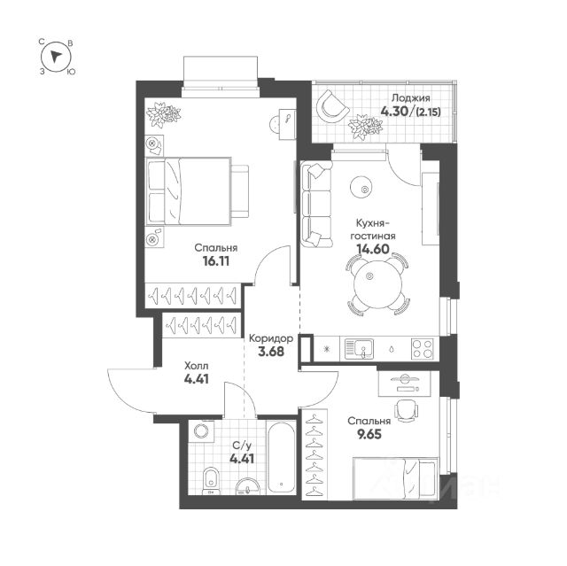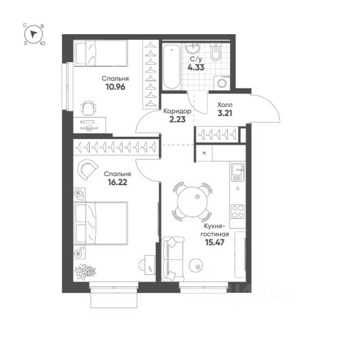 Справа от ванной комнаты расположен вход в комнату площадью 16,3 кв.м. Окно комнаты, как и лоджия на кухне, обращены на северо-восток. За окном расположено здание высотой 2 этажа, что не создаёт помех для солнца.